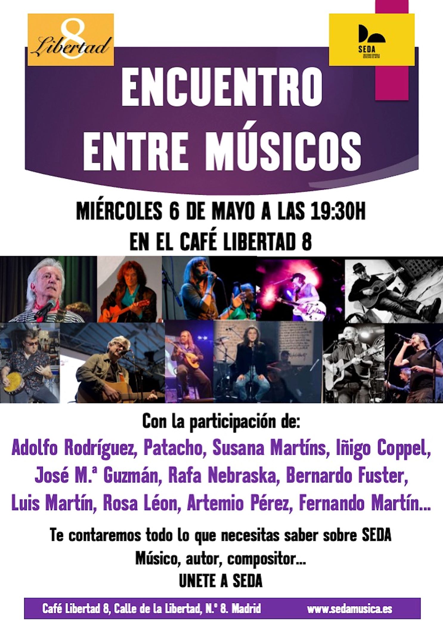 El próximo miércoles 6 de mayo a las 19:30h celebraremos en el “Café Libertad 8” de Madrid, el primero de los “Encuentros entre músicos”.